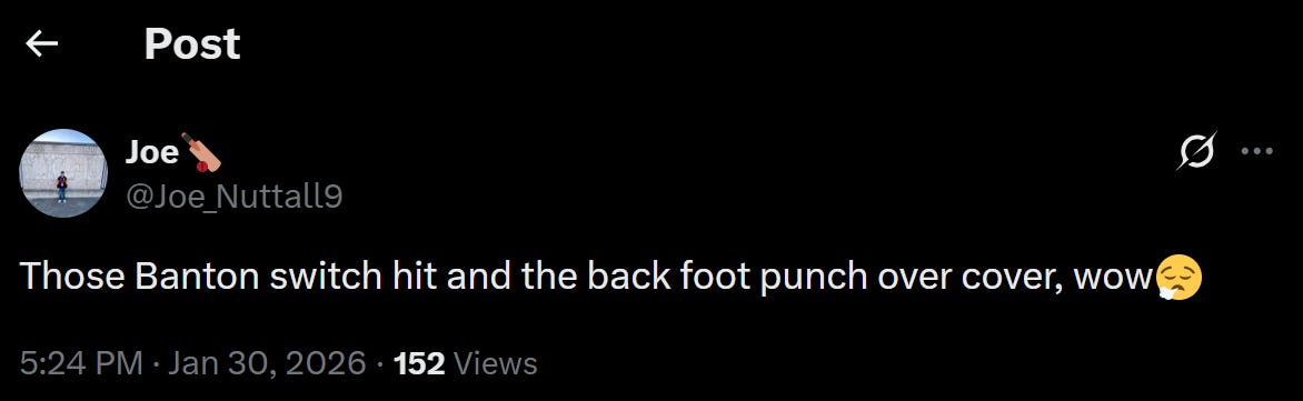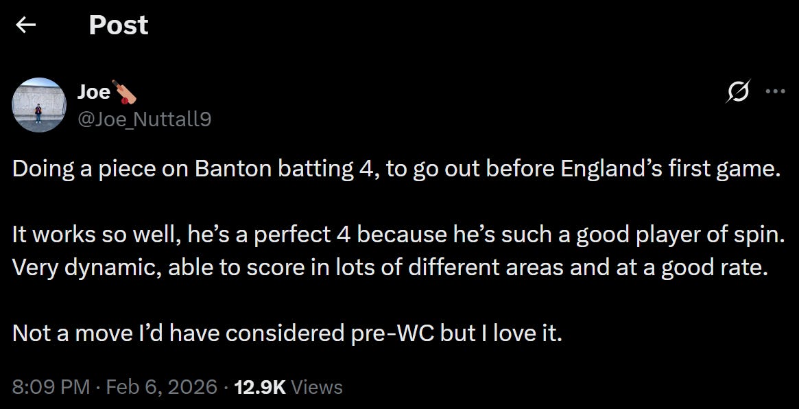 Banton at four just works. Whether this was always the plan, or England stumbled upon it because of Duckett’s injury, I think it’s a genius move from the think-tank of Brook and Brendon McCullum.